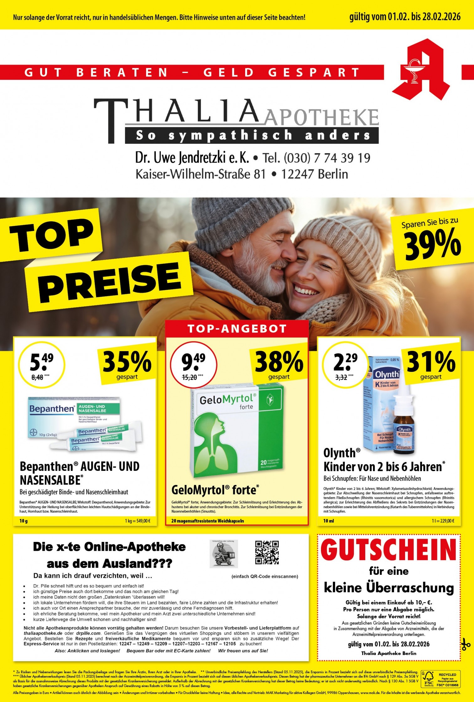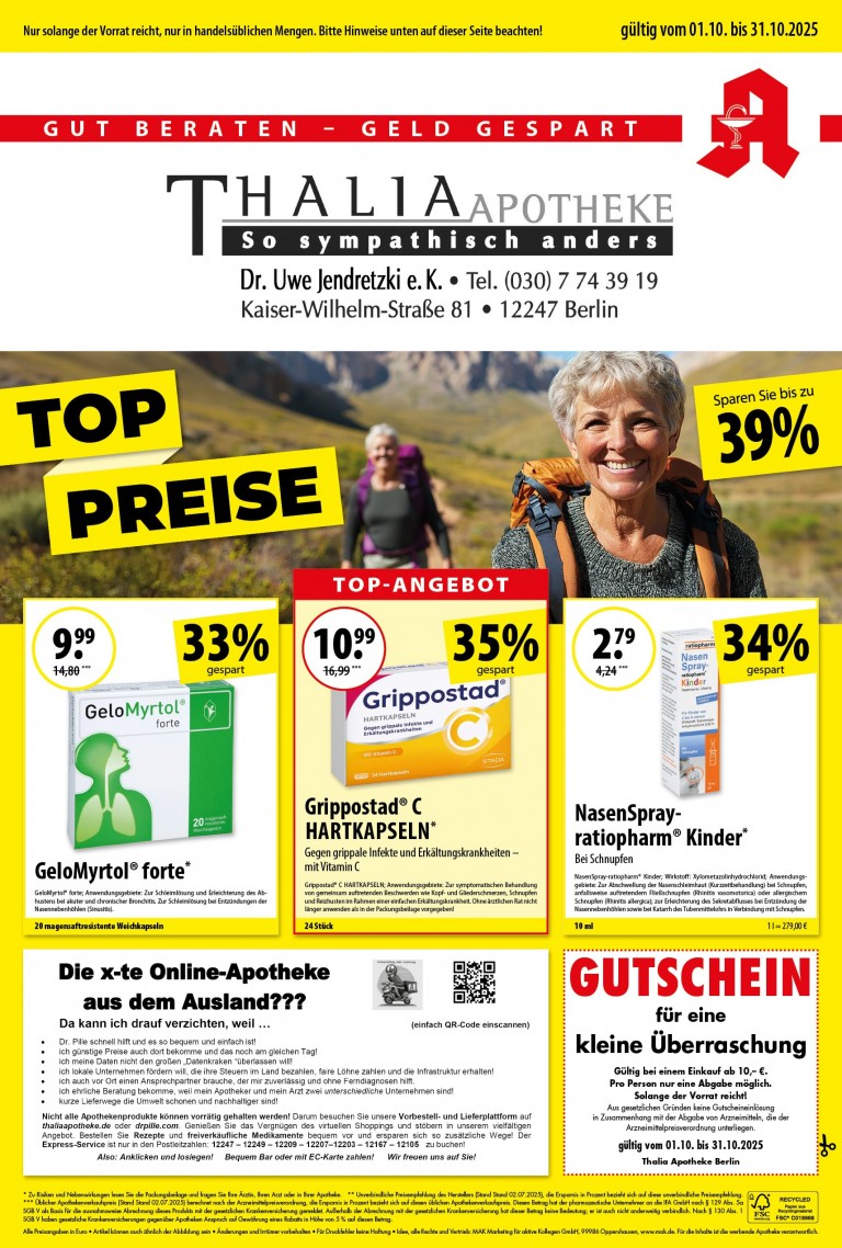 - Sie haben auch vor Ort einen Ansprechpartner, der Ihnen zuverlässig hilft. So sind Sie nicht auf Ferndiagnosen angewiesen! Denn Ihr Apotheker steht Ihnen in der Thalia-Apotheke jederzeit auch direkt gegenüber.